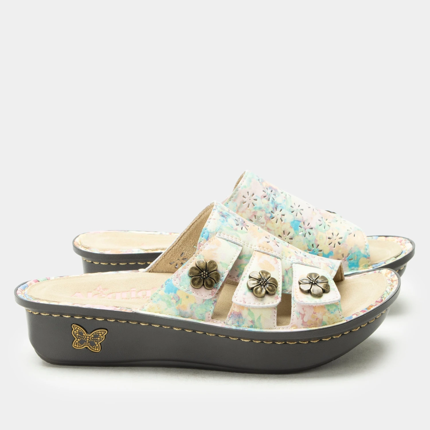 The Julee slide on sandal has a adjustable hook-and-loop closures with a decorative buckle and laser cut details. Sitting on a classic rocker outsole.