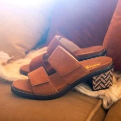 The Julee slide on sandal has a adjustable hook-and-loop closures with a decorative buckle and laser cut details. Sitting on a classic rocker outsole.