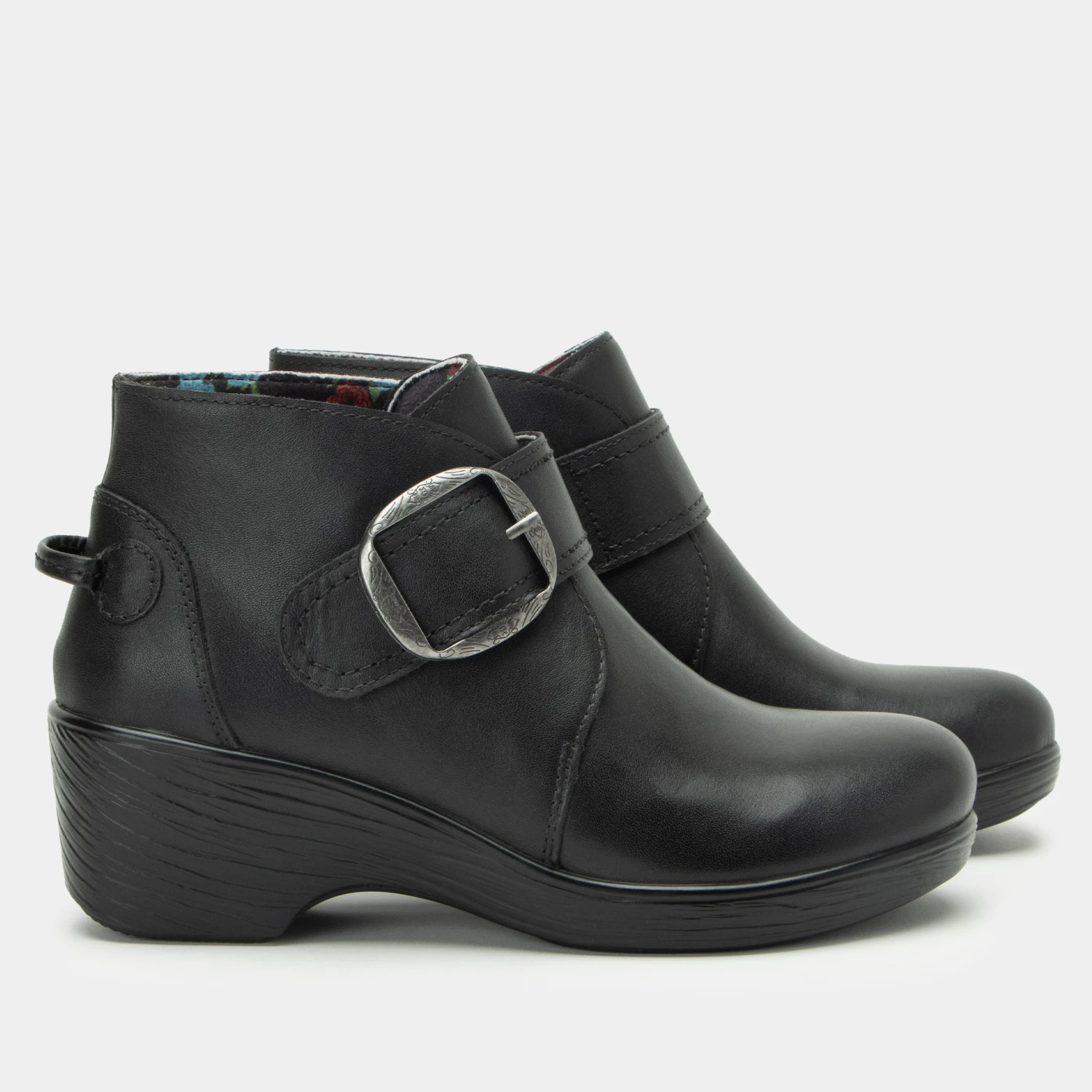 This leather ankle boot with a convenient back pull tab is detailed with a lightweight wood-look slip-resistant wedge. It features an adjustable hook-and-loop strap finished off with a bold metal buckle. The removable suede-lined footbed is made of polyurethane, cork and memory foam.